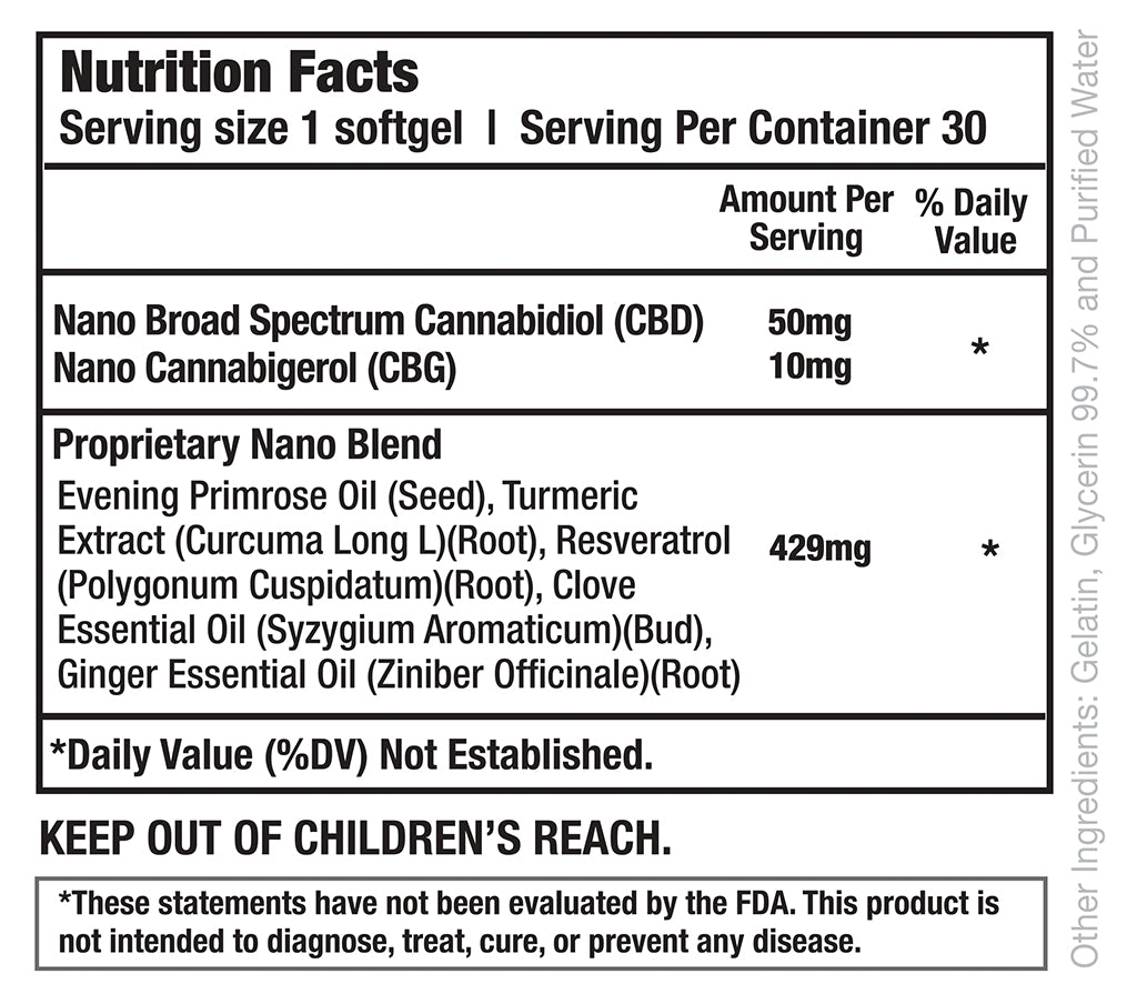 A blend of highly absorbable nano-CBD (2x more than most CBD products) and nano-CBG, a close cousin to CBD, targets inflammation and nausea and is non-psychoactive.